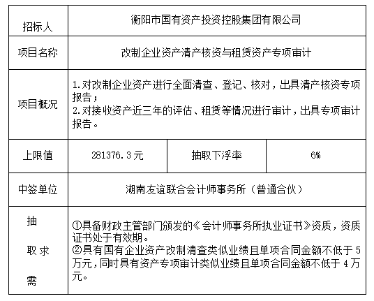 改制企業(yè)資產(chǎn)清產(chǎn)核資與租賃資產(chǎn)專項審計于2025年10月17日在衡陽國投4棟3樓評標(biāo)室進行了隨機抽取,現(xiàn)將相關(guān)信息予以公示。